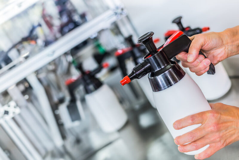 Plastic parts in bright colours, different nozzles, a wide range of resistances to aggressive chemicals – there are no limits to the options for creating your bespoke compressed air sprayer … at least, hardly any … we can still only dream of bottles made of plush, chrome or pressboard.